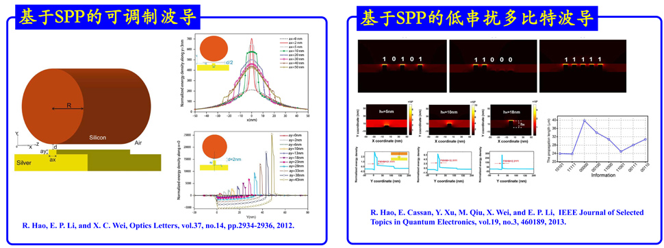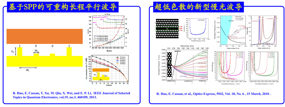 表面等离激元是未来光电集成技术的重要研究领域。本研究团队基于有限元、有限差分等数值方法,仿真并设计了基于SPP的可重构长程平行波导、高性能慢光波导等器件。多篇学术论文已发表在Optics Letters、 Scientific Reports等国际著名学术期刊中。
