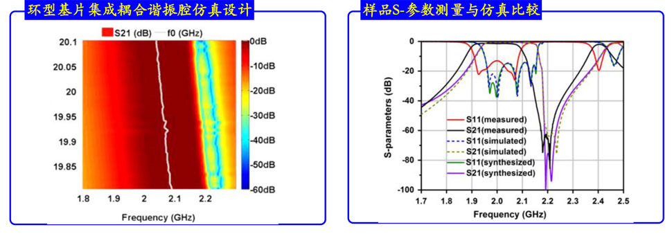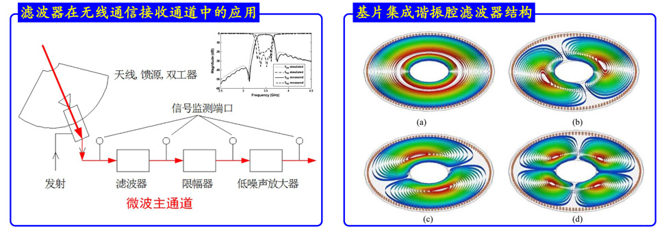高性能(低插损、高Q值和小型化)腔体滤波器广泛地用于无线通信系统设计中。研究团队与上海交大合作,实现了多种基于基片集成谐振腔的高性能滤波器创新性设计和样品制备,具有小型化、插入损耗低、选频特性好和功率容量高等优势。研究论文已发表在IEEE T-MTT等汇刊中。