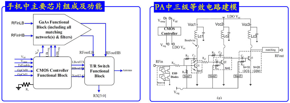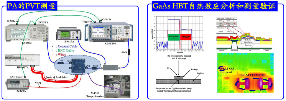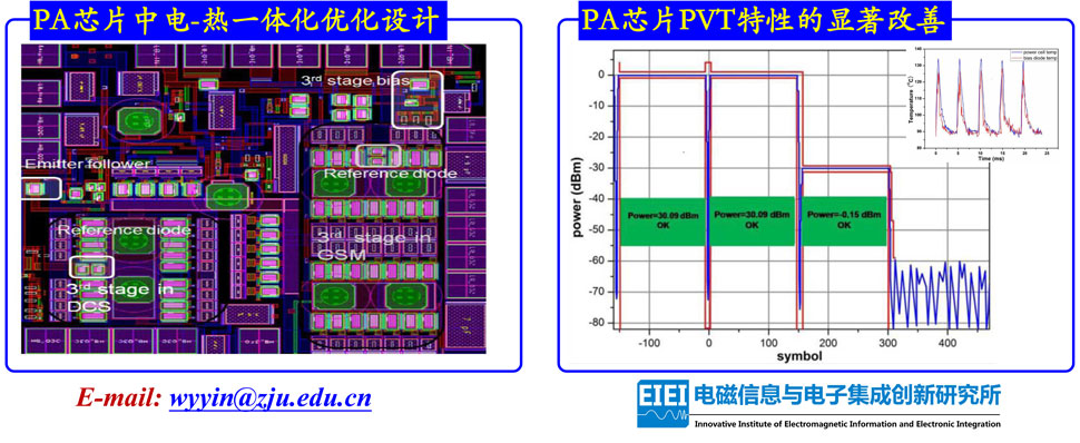 手机中GaAs PA芯片存在严重的自热效应,会引起电性能的降低,必须进行其电-热一体化设计。为此,研究团队完成了PA功率随时间变化(PVT)测量、PA中GaAs HBT电-热一体化仿真及热成像仪测量、芯片电-热一体化优化再设计和流片测量验证研究,成果已发表在2015IEEE T-MTT汇刊中。