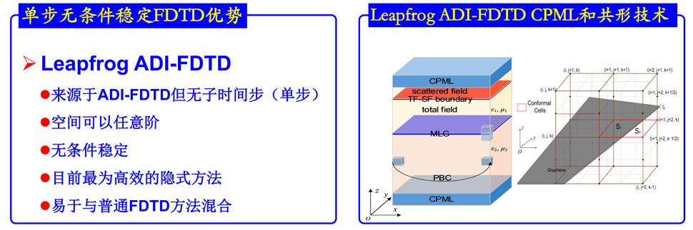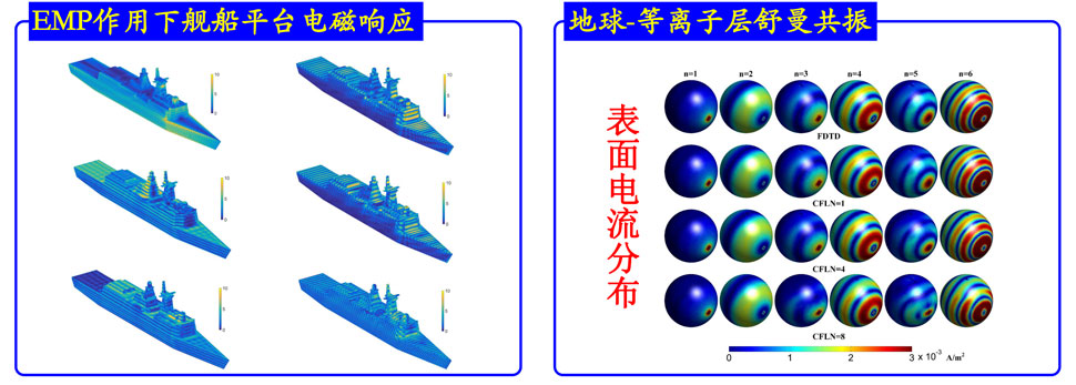 单步无条件稳定FDTD方法具有比传统FDTD更多的优势,是目前最为高效的隐式方法。研究团队自主开发了Leapfrog ADI-FDTD求解器,高效仿真了舰船平台电磁响应、舒曼共振和新型石墨烯结构中太赫兹响应及其传播模式,论文已分别在IEEE T-EMC、T-NL和Optics Express等刊物中发表。